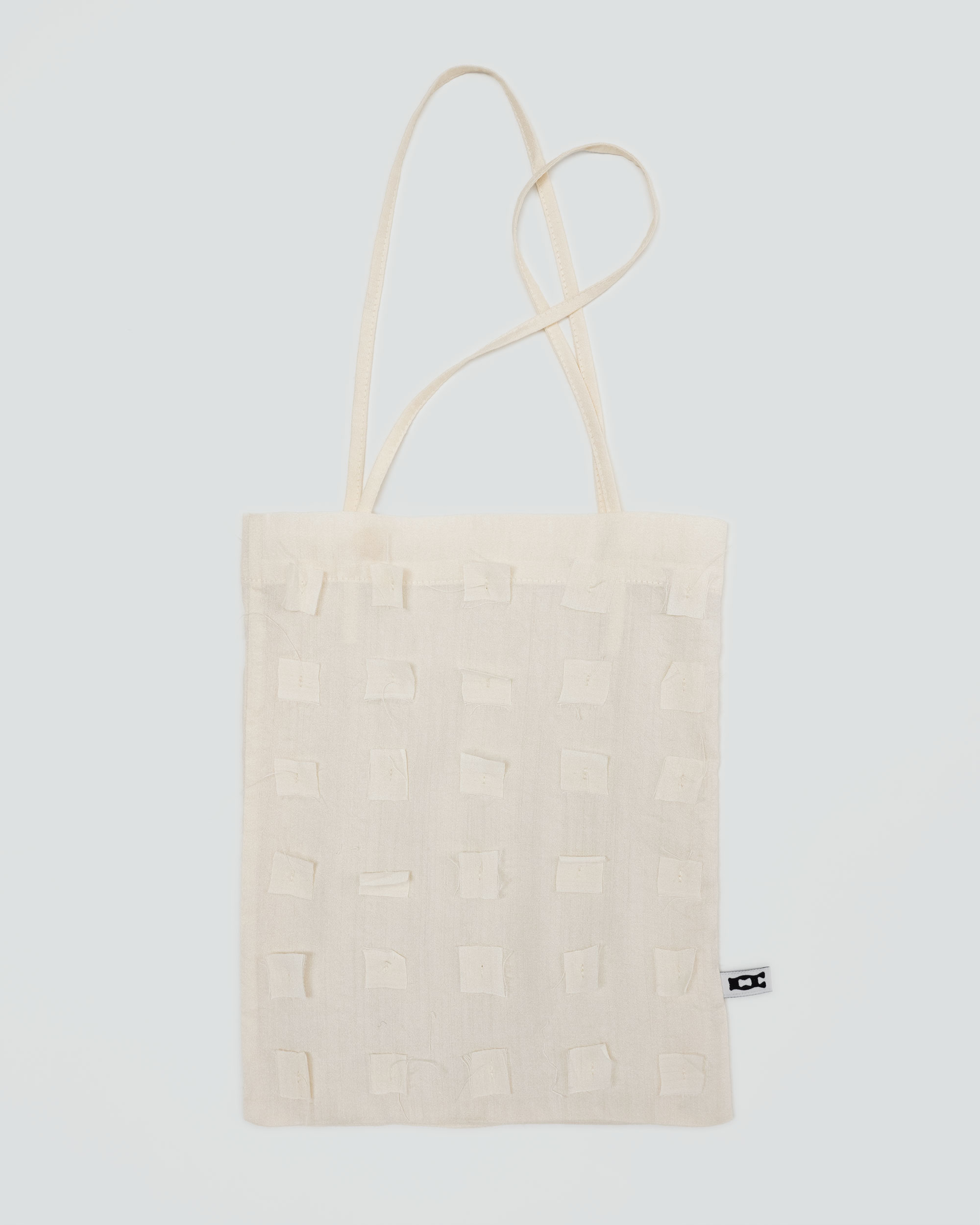 Undyed muga silk bag with the “A" label and a cotton-linen lining. Offcuts of the bag were used to cover it completely, creating a pattern in volume. In motion, it gives a sparkling effect. Zero waste piece. 2 × 2 cm fabric squares.