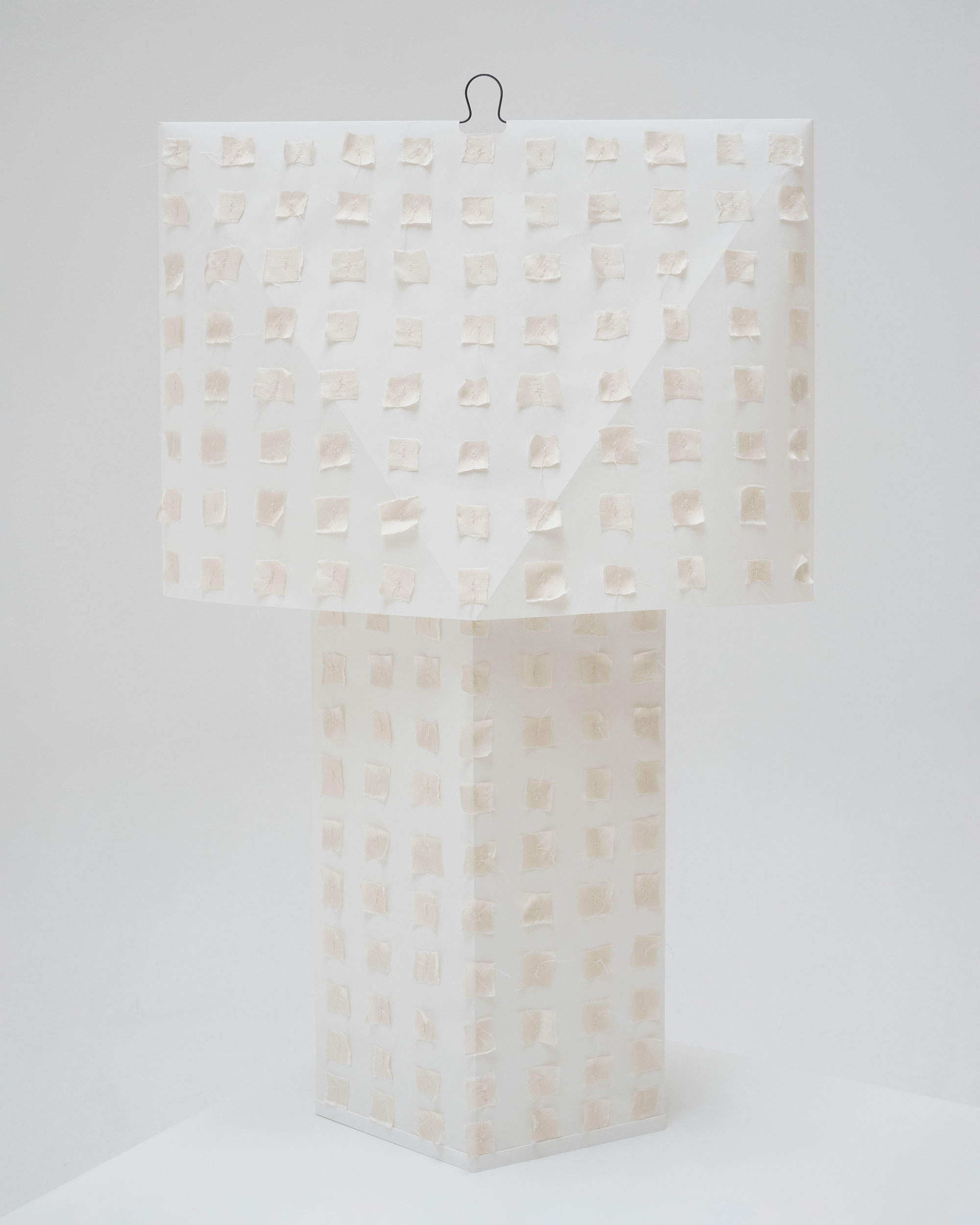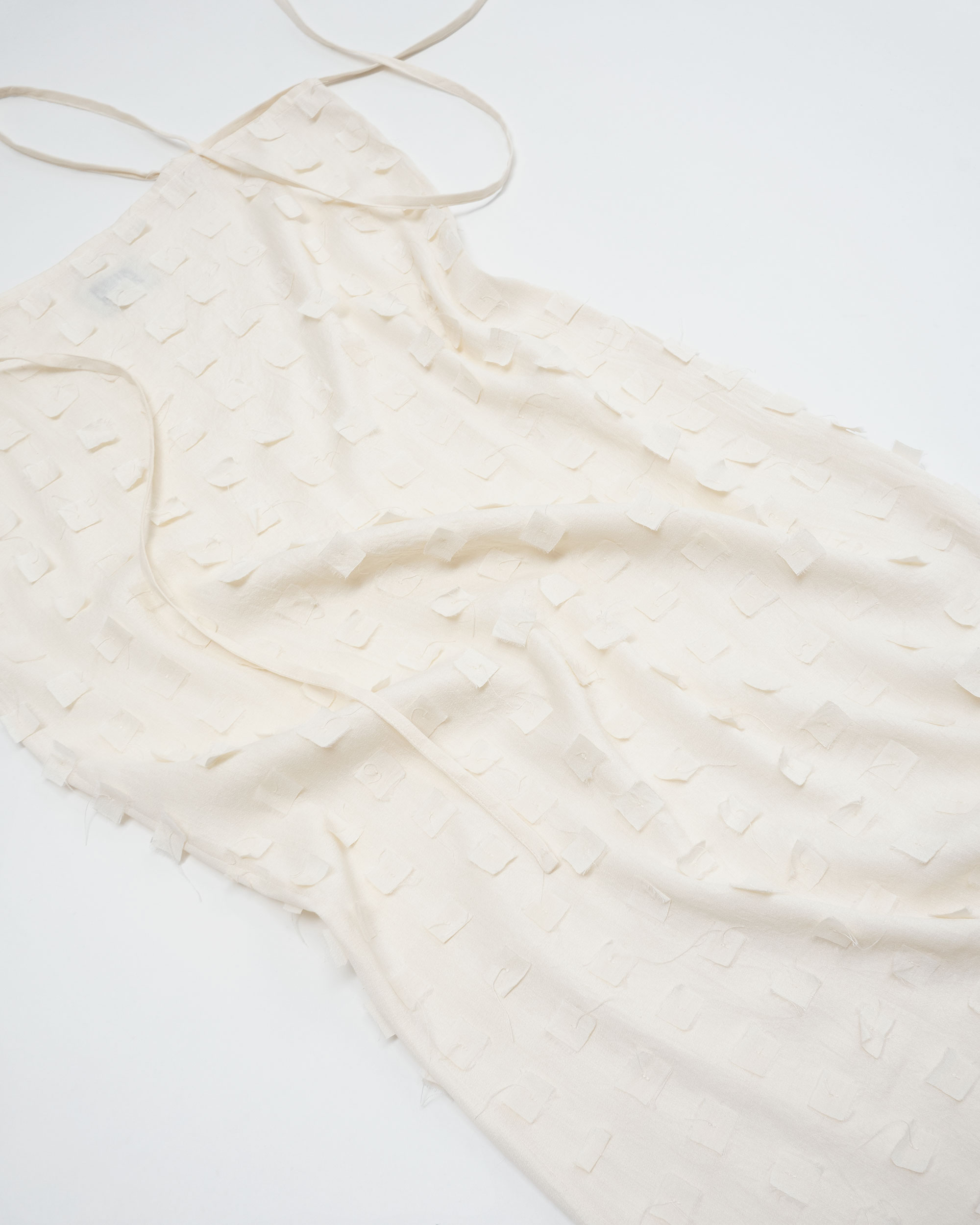 Undyed muga silk long dress with a low straight neckline and thin adjustable straps. Offcuts of the dress were used to cover it completely, creating a pattern in volume. In motion, it gives a sparkling effect. Side splits to hem. Zero waste piece. 2 × 2 cm fabric squares.
