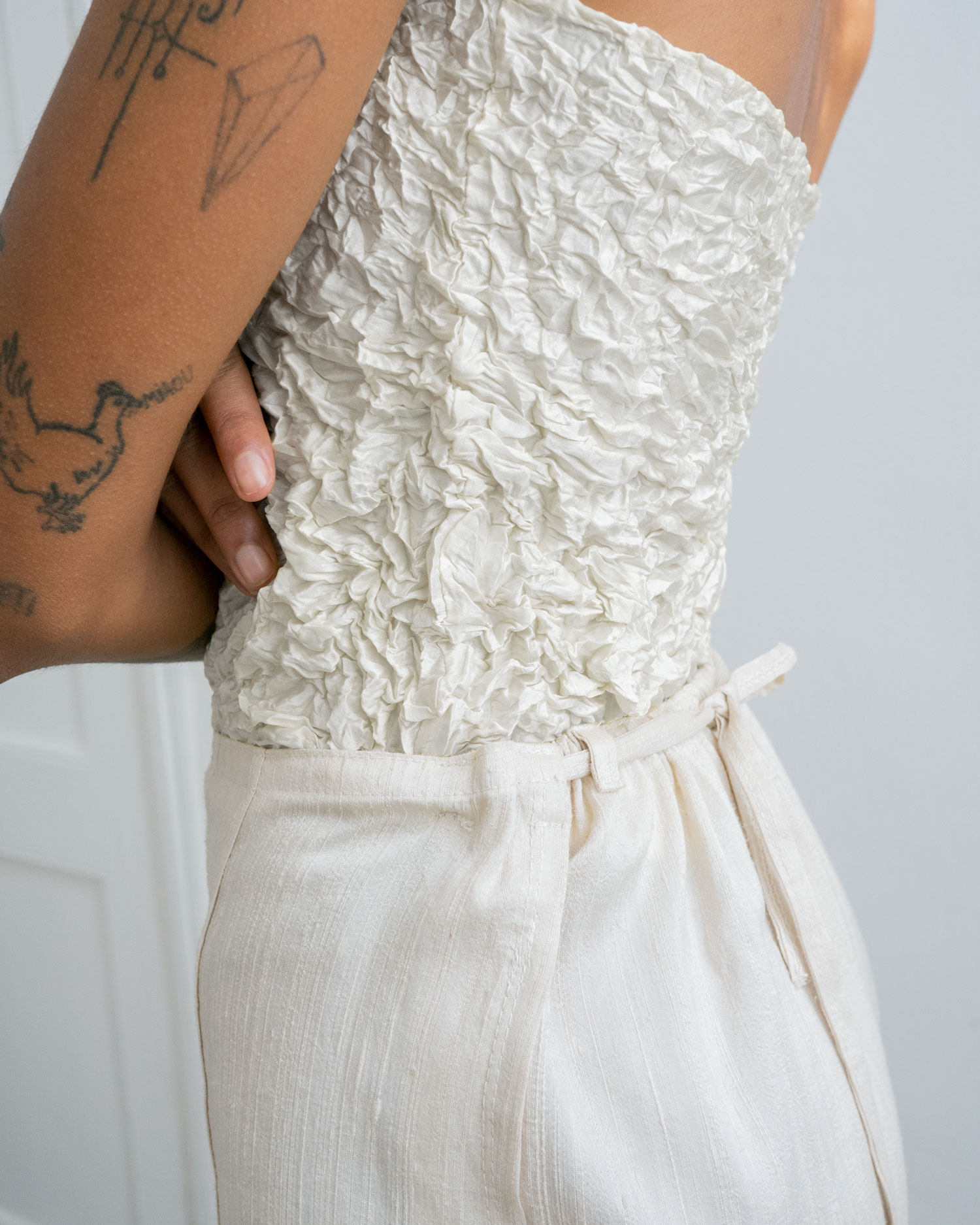 Wild silk pants with a casual fit and vent at cuffs, they tie in the back with an adjustable drawstring.