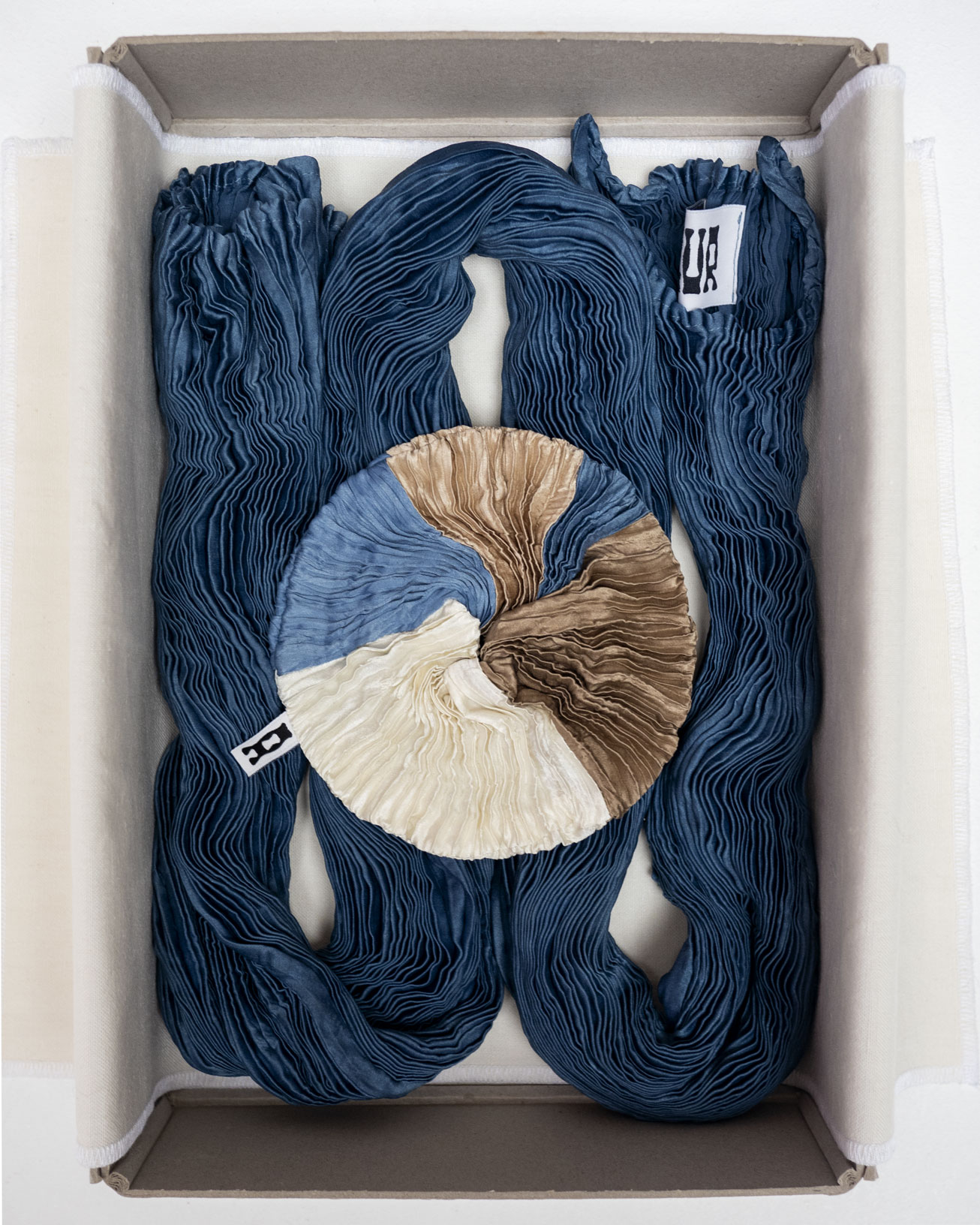 Plissé satin silk scrunchie with the “A” label. One-of-a-kind piece made from offcuts from the atelier. Dyed with natural indigo, oak gall, iron, myrobalan tree.