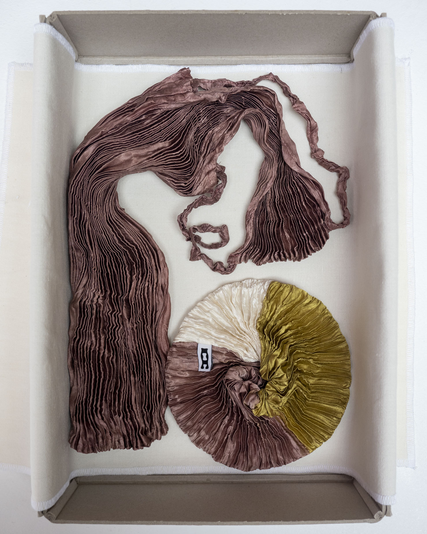 These pieces are artisanally hand dyed with locally grown plants and hand pleated one pleat at a time, resulting in a singular fabric with subtle hues and unique texture that has become Azur’s signature.
