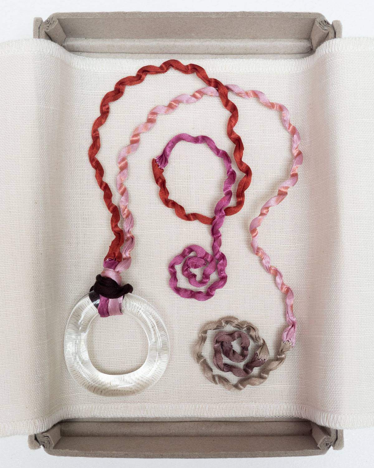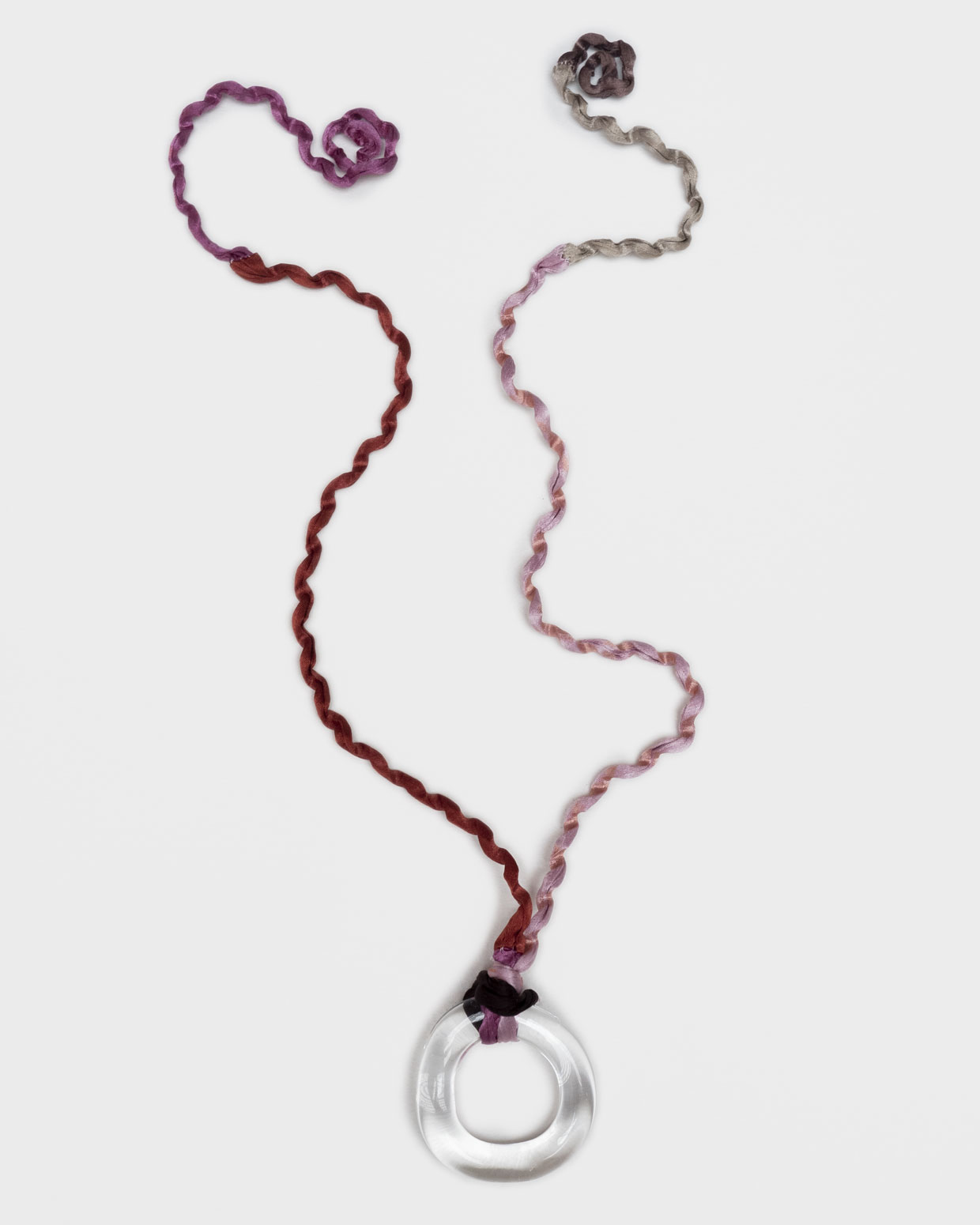 Flameworked clear glass ring pendant with a hand-twisted satin silk cord. One-of-a-kind piece made from offcuts from the atelier. Dyed with madder roots, oak gall, iron and cochineal insects.