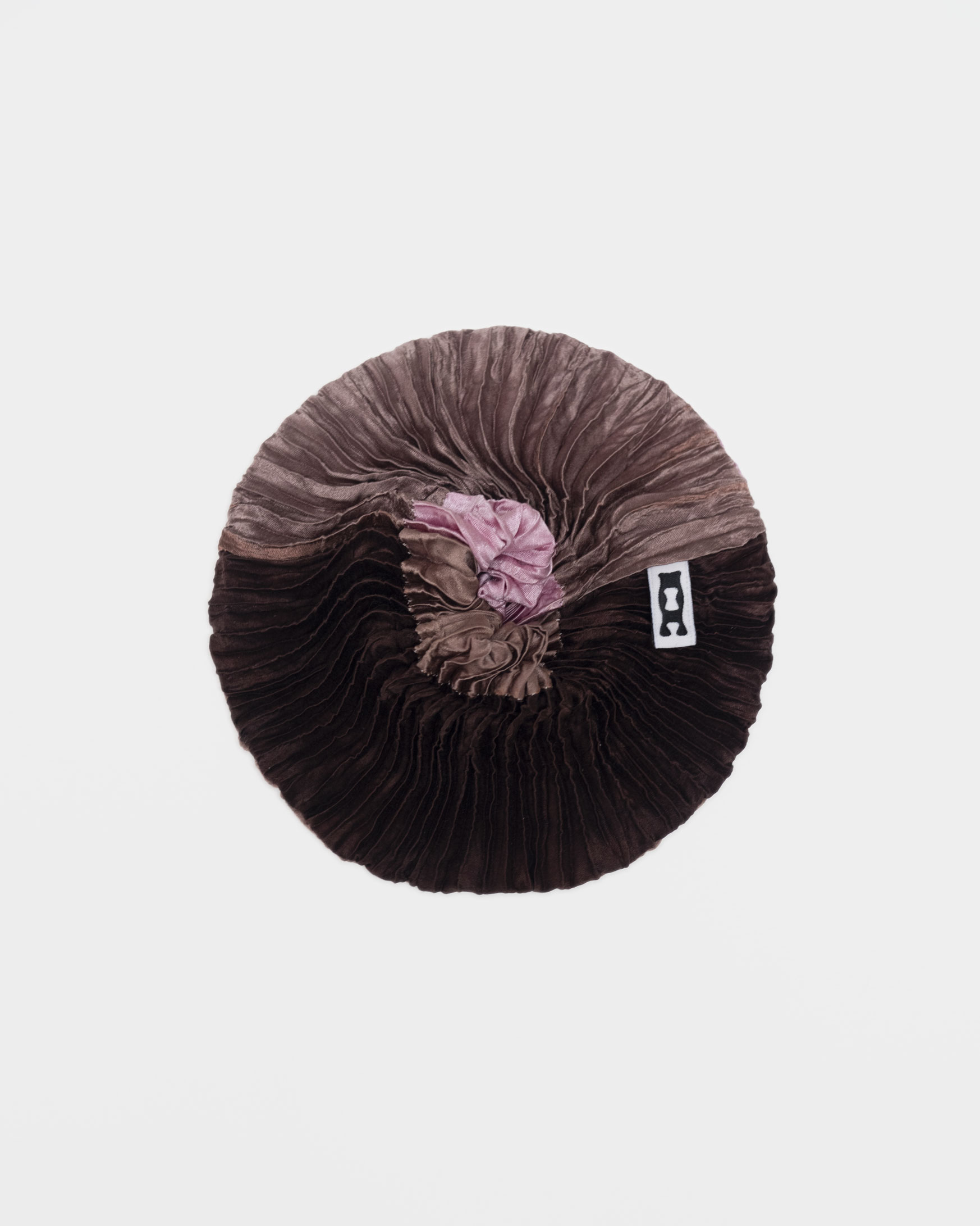Plissé satin silk scrunchie with the “A” label. One-of-a-kind piece made from offcuts from the atelier. Dyed with madder roots, oak gall, iron and cochineal insects.