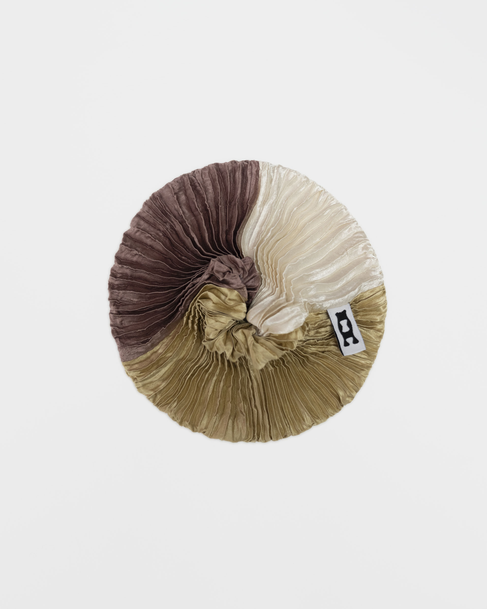 Plissé satin silk scrunchie with the “A” label. One-of-a-kind piece made from offcuts from the atelier. Dyed with madder roots, oak gall, iron, St John's wort and myrobalan tree.