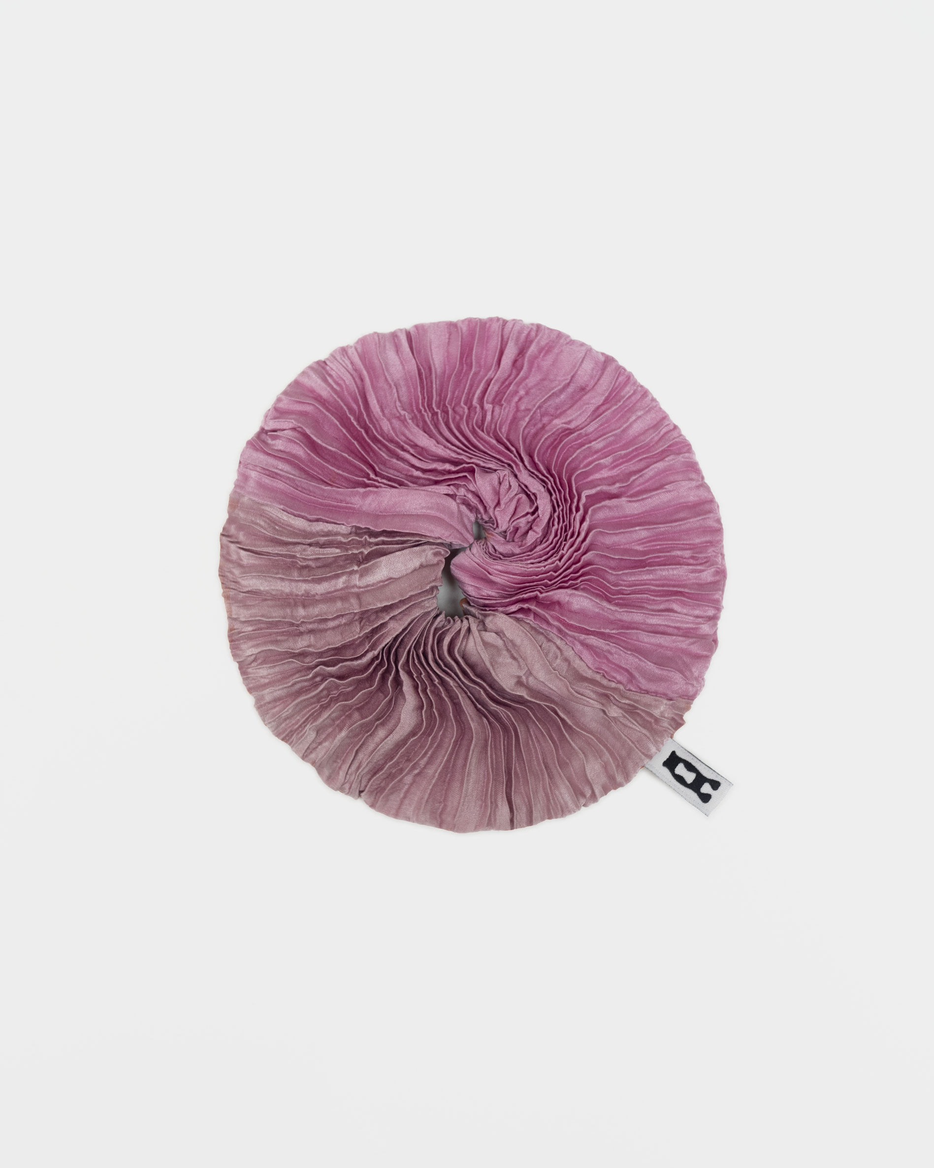 Plissé satin silk scrunchie with the “A” label. One-of-a-kind piece made from offcuts from the atelier. Dyed with madder roots, oak gall and cochineal insects.