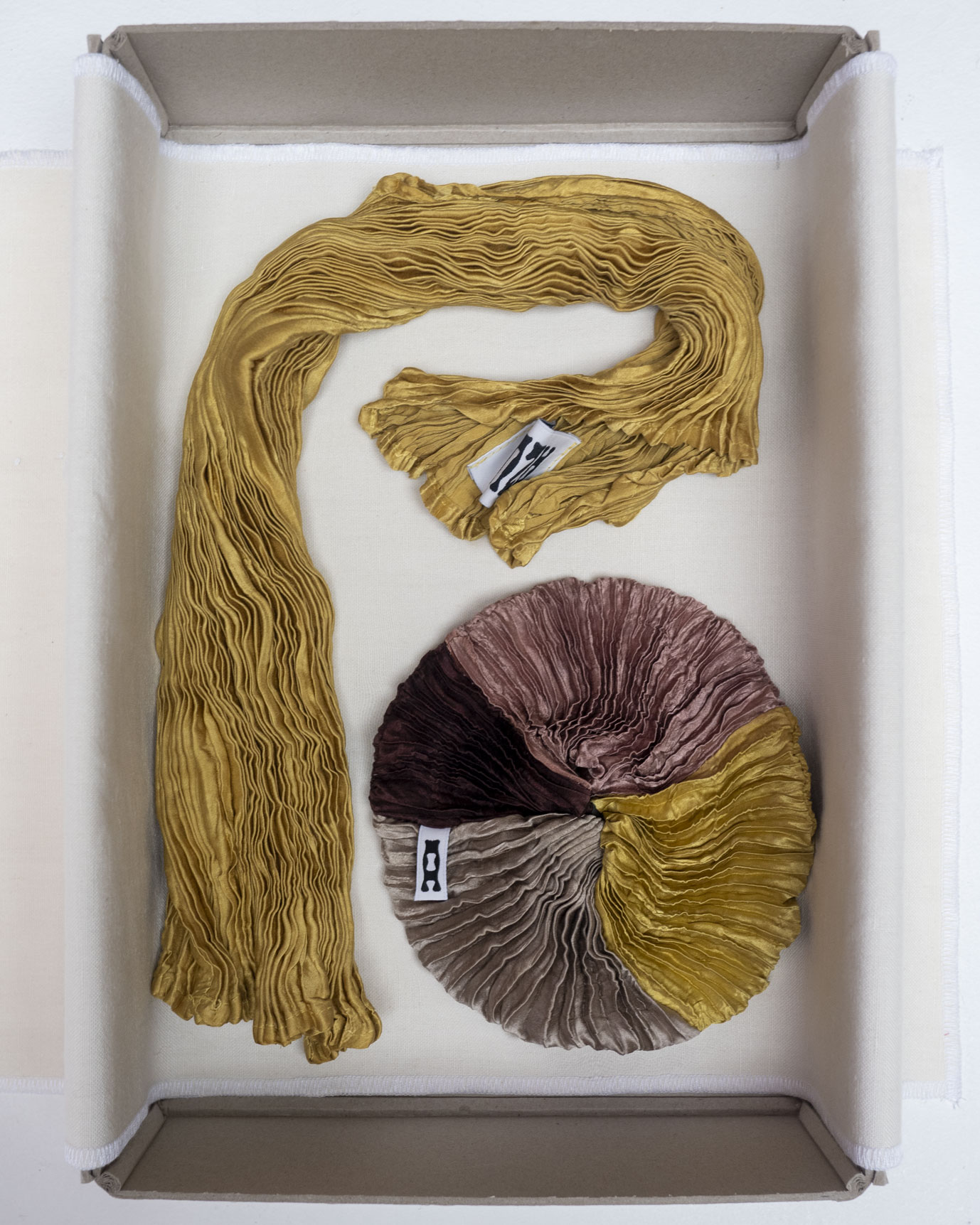 Plissé satin silk scrunchie with the “A” label. One-of-a-kind piece made from offcuts from the atelier. Dyed with pomegranate skin, madder roots, iron and acacia tree.