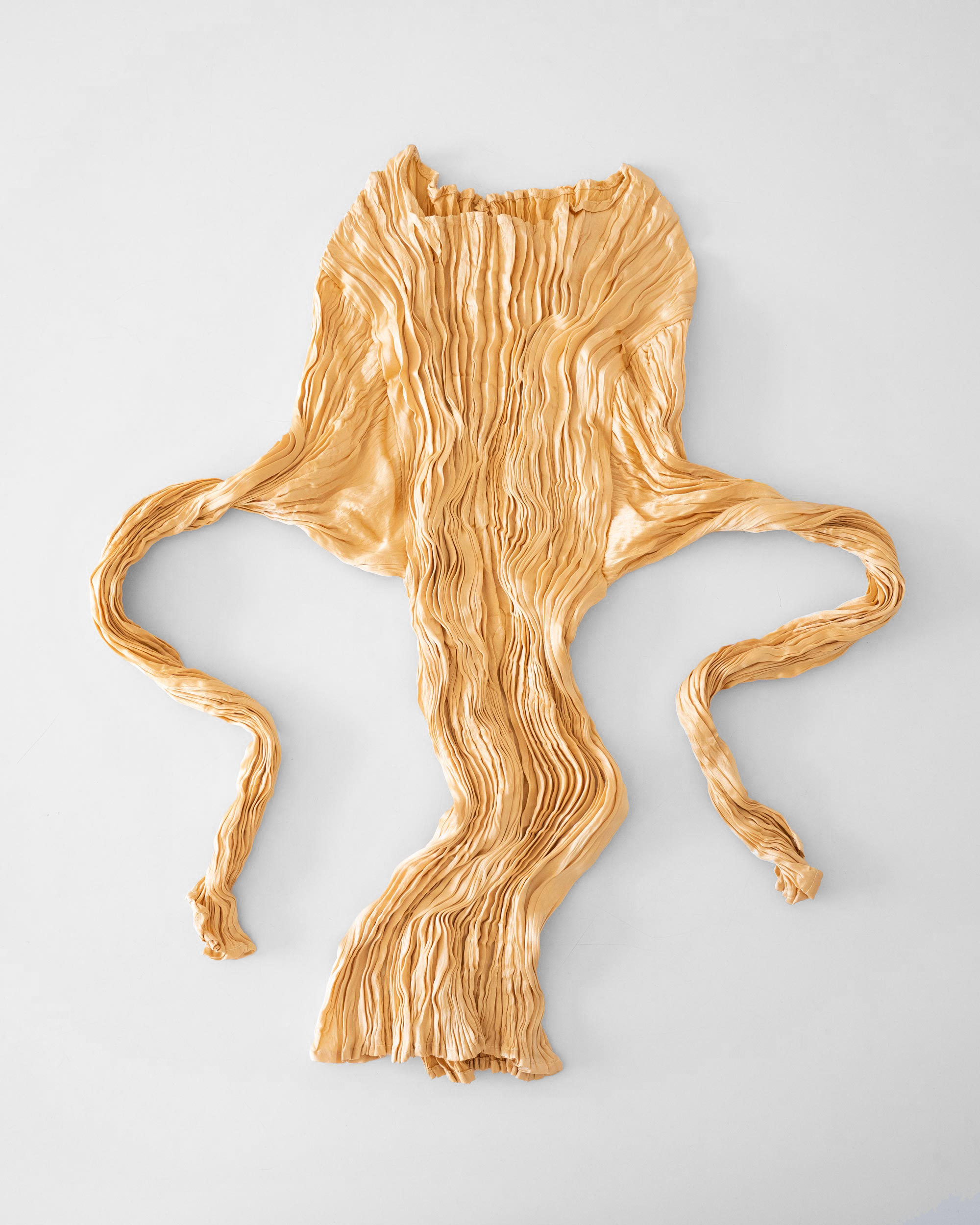 The pleating on silk is not permanent, in order to preserve it we recommend to keep away from water and suggest professional soft dry clean only. The pleating will evolve and soften over time as you wear it, in order to maintain it in its best condition, we advise to always store the garments gently rolled-up in its fabric pouch. Botanically dyed colors may fade if left in the sun, in order to preserve them we recommend storing the pieces in a dark place.