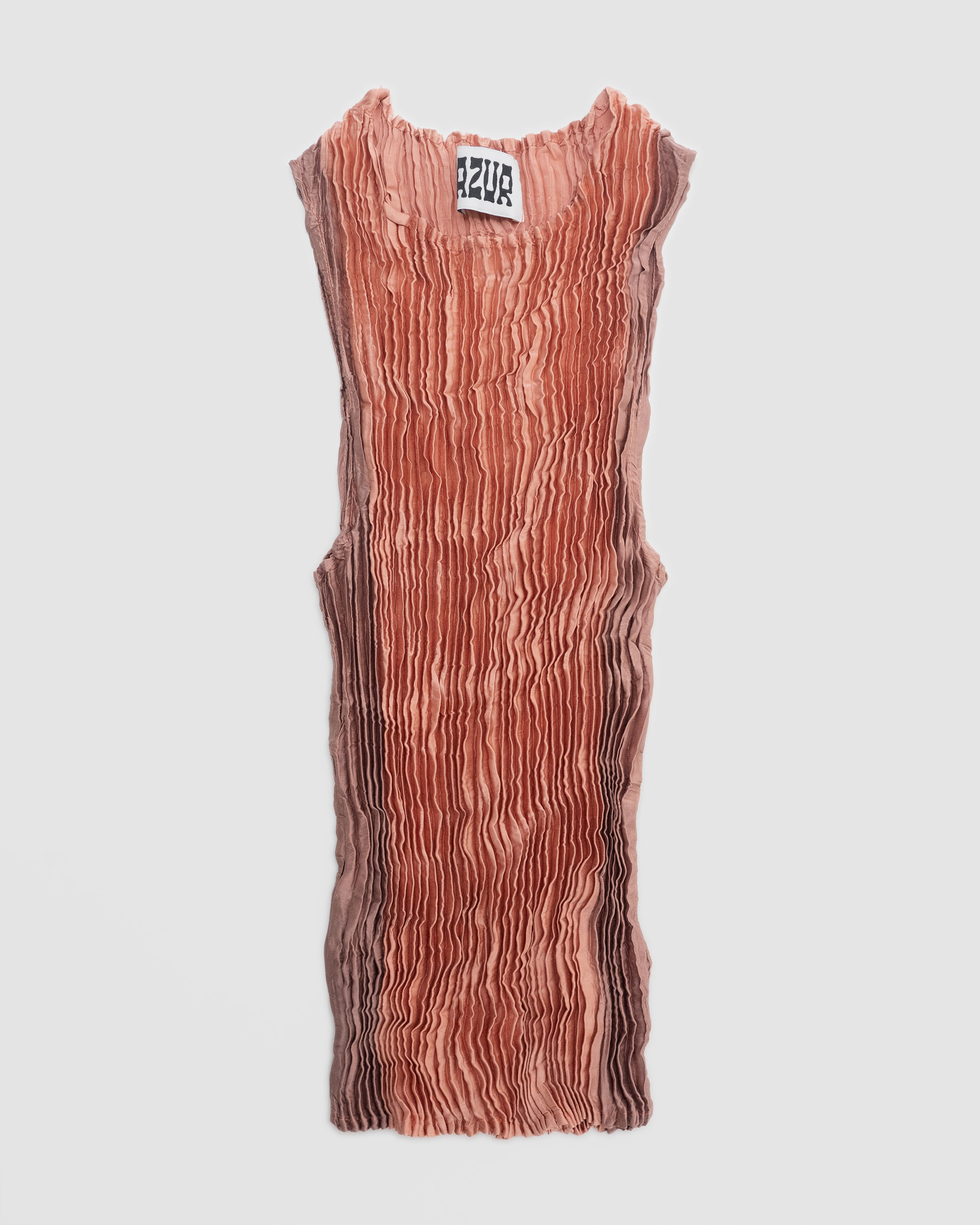 Plissé satin silk tank top with a round neck. Form fitting and flattering. Dyed with madder roots, oak gall and iron acetate. Two-tone pieces are obtained by partially immersing the fabric in an iron bath at the end of the dyeing process.