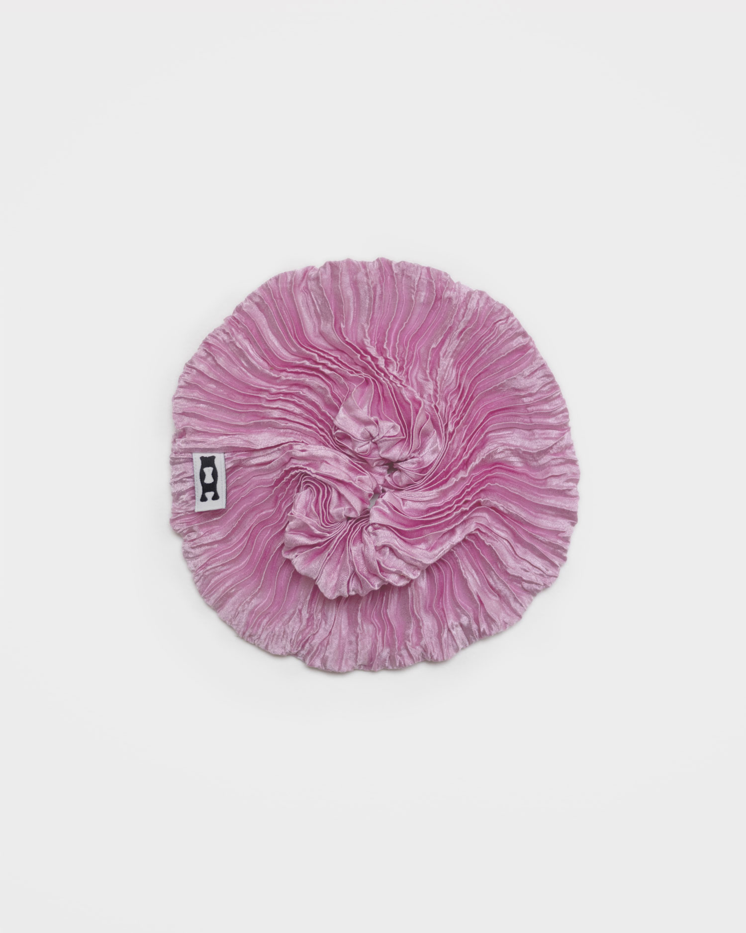 Plissé satin silk scrunchie with the “A” label. Dyed with cochineal insects and chlorophyll extract.