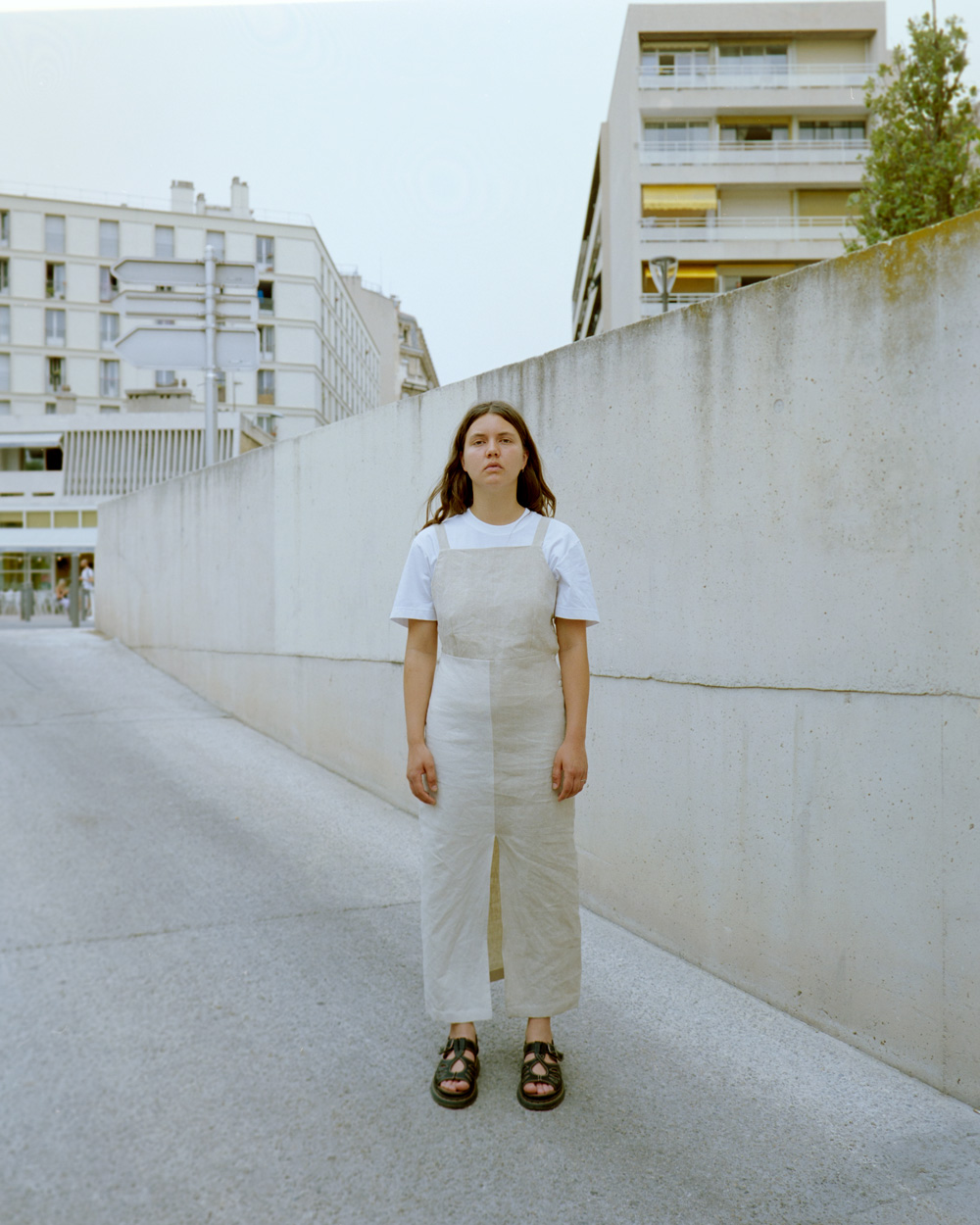 Light beige cotton-linen and dark beige linen dress with wide straps, a front sleet and six corozo buttons side closure.