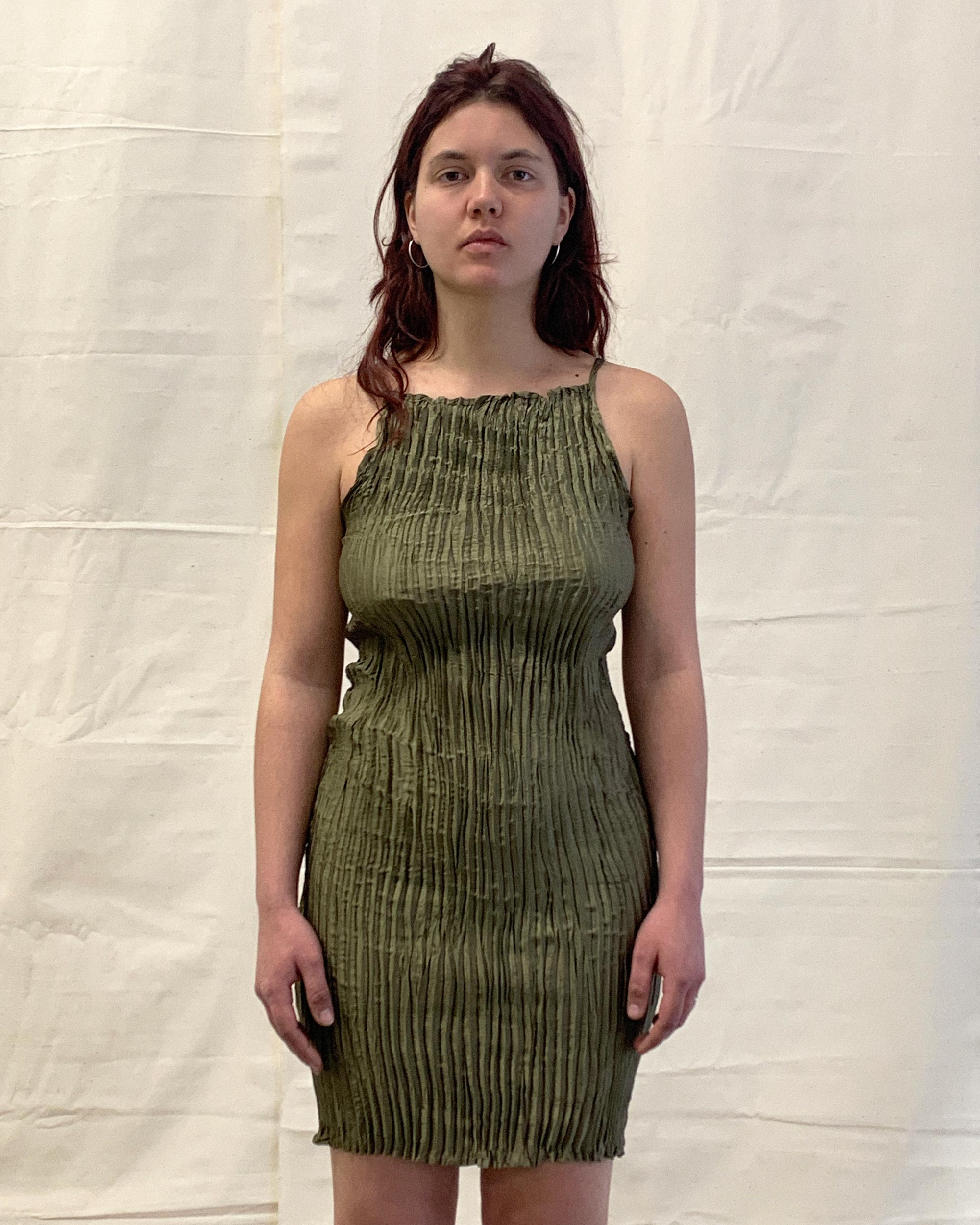 Plissé satin silk short cami dress with fine straps and a square neckline. Form fitting and flattering. Naturally hand-dyed with St.-John’s Wort and iron.