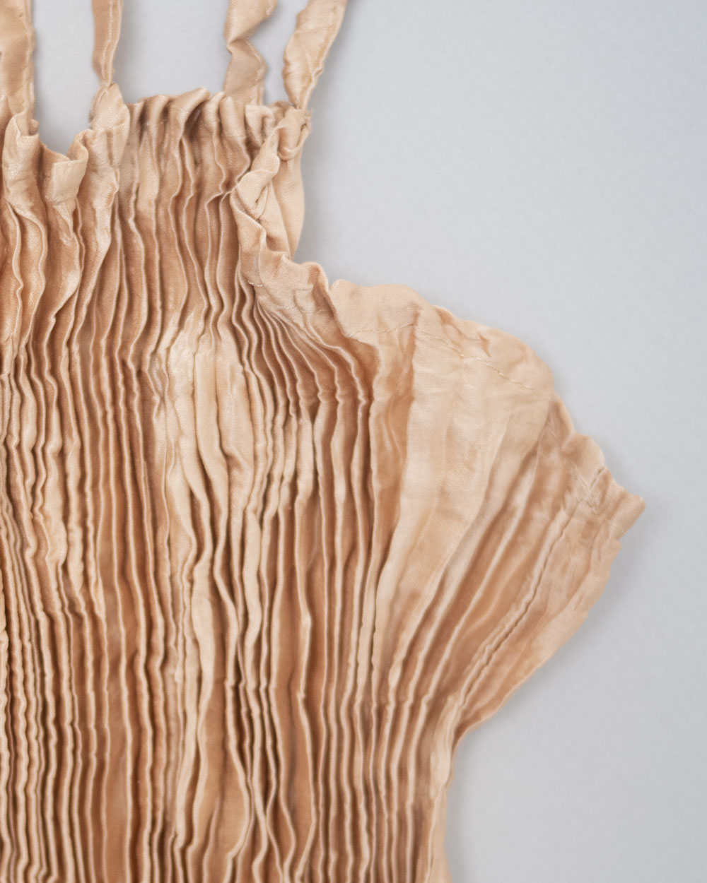 This top features several brown spots on the straps, collar hem, side seams, and bottom hem, resulting from an issue during the steaming and pleating process. The straps are shorter than usual, resulting in the top appearing slightly shorter when worn.